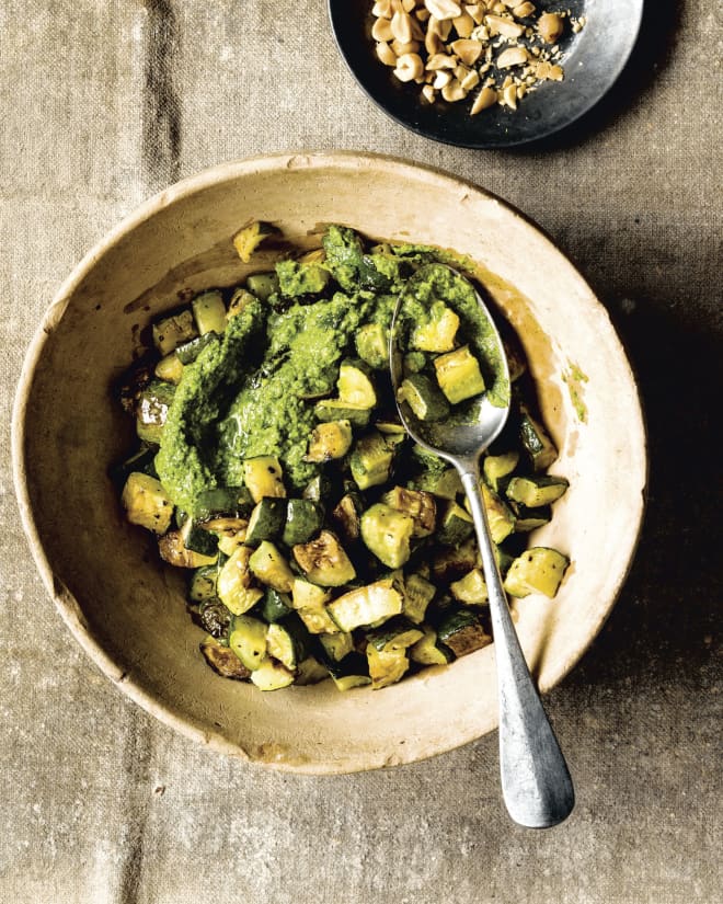 Bryant Terry’s Oven-Roasted Zucchini with Collard-Peanut Pesto and Roasted Peanuts